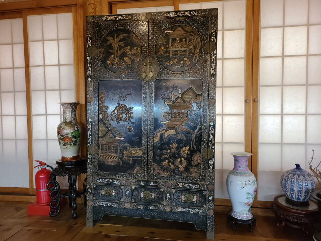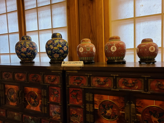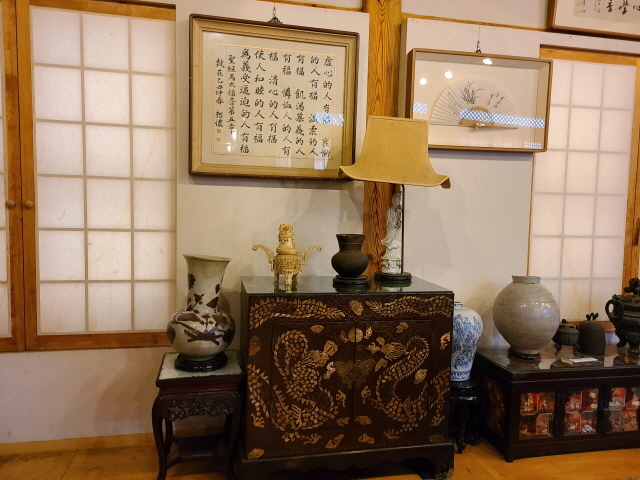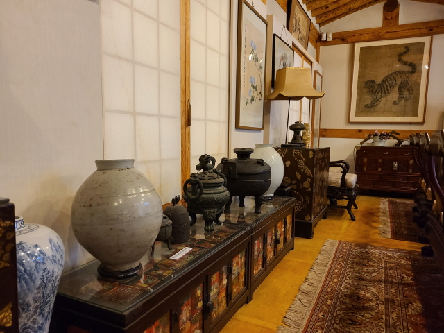 실내화를 갈아 신고 실내로 들어서면, 우선 소설가 한무숙의 사진과 함께 한무숙 연보가 왼쪽 벽면에 드러난다. 그리고 회화에서 도자기, 고가구, 그림까지 다채롭다.