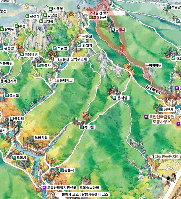 망월사로 오르는 길은 매표소에서 대원사, 원효사, 광법사를 차례로 돌아서 가는 코스가 있고 원도봉계곡을 따라가는 코스가 있는데 망월사에서는 두 갈래 등산로 중 어느 쪽으로 오르든 포대능선에 이르게 된다.