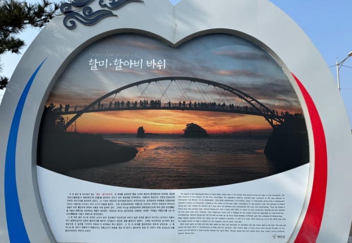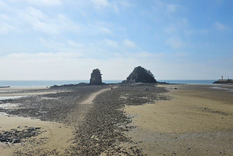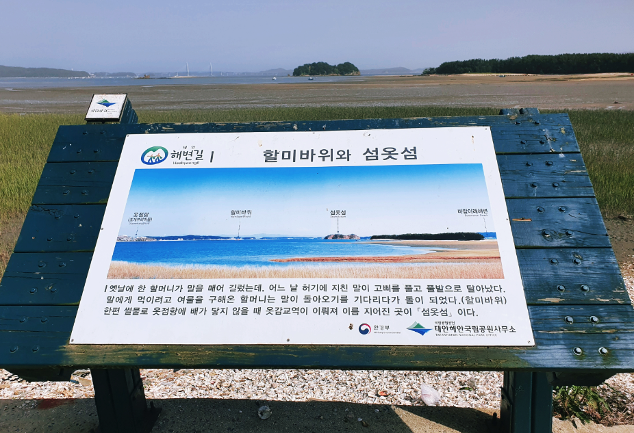 특히, 오른쪽 해변은 등을 나란히 하고 선 할미바위와 할아비바위가 멋진 풍광을 드러내는 곳이다. 신라 때 장보고의 부하 장수로 안면도를 지키던 승언이 갑자기 북방으로 발령이 나서 떠났는데, 그의 부인 미도가 남편을 기다리다가 지쳐 할미바위가 됐다는 이야기가 서린 곳이다. 물이 빠져 갯벌이 드러나는 낮에는 조개를 캐거나 갯바위에서 게를 잡으러 오는 사람들로 붐빈다.