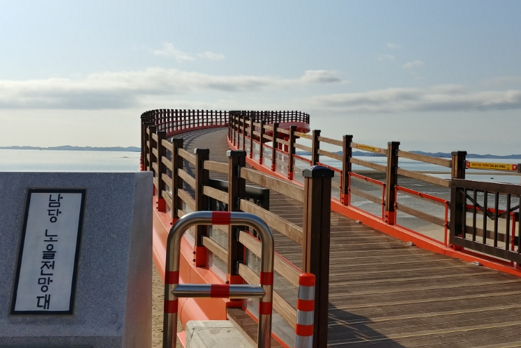 남당항 바로 옆에 있는 남당 노을 전망대는 이름 그대로 아름다운 석양을 볼 수 있는 전망대이다. 금빛 모래사장이 길게 펼쳐져 있는 바닷가 중간에, 바다를 향해 길게 뻗어져 있어 마치 하늘과 바다를 향해 나아가는 기분을 느끼게 해 준다. 전망대는 빨간색으로 도색되어 바다색과 인근 산의 초록색과 대비되어 눈에 띈다. 또, 일몰 때에는 붉게 물드는 하늘과 어우러져 그 또한 멋진 풍경을 보여준다. 가족과 함께 연인과 함께 백사장을 걷거나, 바다를 바라보고 명상을 즐기는 것만으로도 힐링이 된다.