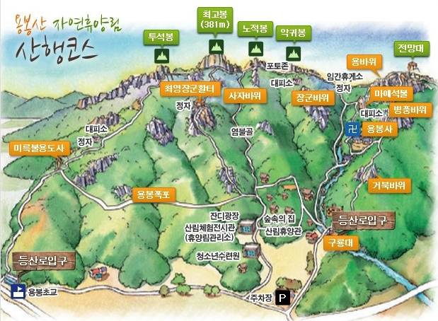 용봉산 정상에서 충남도청 신도시가 한눈에 내려다보이고, 예산의 덕숭산(수덕사), 서산의 가야산, 예당평야의 시원한 경치도 일품이다. 산세가 험하지 않아 남녀노소 누구나 쉽게 오를 수 있어 사시사철 등산객이 끊이지 않는다. 용봉산자락에는 용봉산자연휴양림이 자리하고 있다.