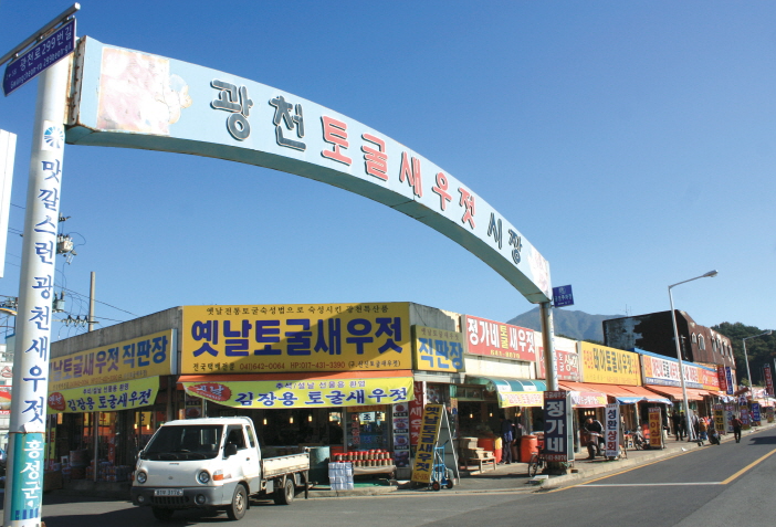 광천의 새우젓은 그 역사가 고려 시대로 거슬러 올라간다. 광천로와 나란한 새우젓 가게들은 그 후손이다. 새우젓 숙성 방법도 세월을 거듭하며 한층 발전했다. 새우젓은 어느 지역에서 어떻게 숙성시키느냐에 따라 맛이 달라지는데 광천에서는 토굴을 이용한다. 일제강점기 마을 뒷산에 뚫은 광산이 남아 굴에서 새우젓을 숙성시키자 감칠맛이 살아났다. 전국 새우젓 생산량의 약 60%가 이곳에서 생산된다.