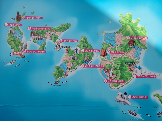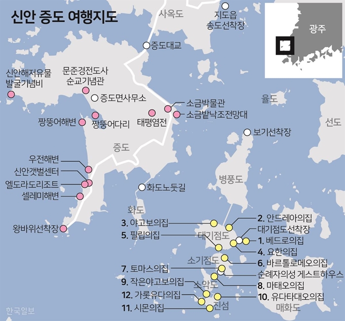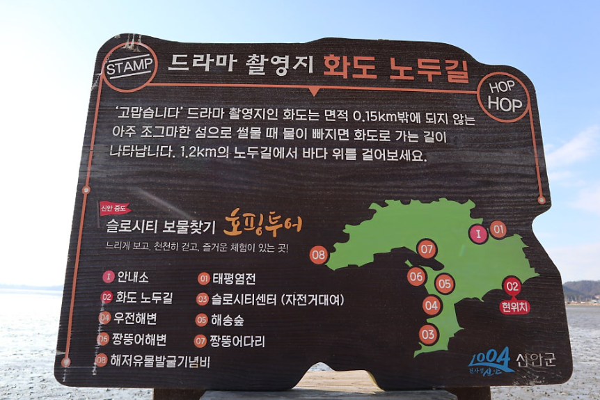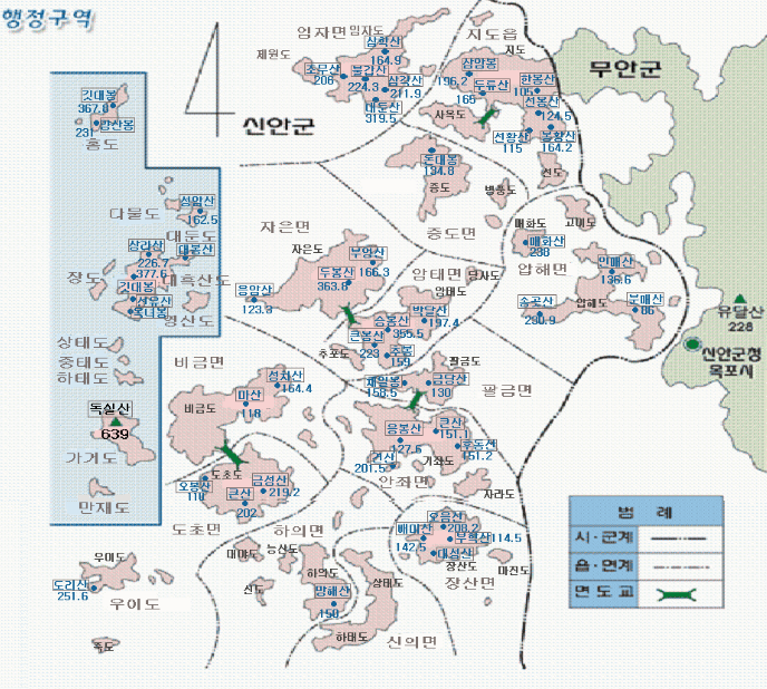 *지도읍 / 임자도 / 증도 / 병풍도 / 섬티아고 / 압해도 / 암태도 / 자은도 / 팔금도 / 안좌도*