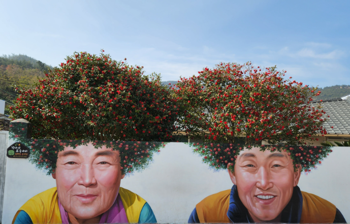 암태도는 압해도에서 천사대교를 지나 에로스서각박물관을 거쳐 암태도 중간쯤 기동삼거리가 나온다. 이곳이 암태도에서 가장 '핫'한 사진 촬영 장소다. 동백나무 파마머리 벽화가 있는 곳. 평범한 가정집 담장에 인심 좋은 노부부의 얼굴이 큼지막하게 그려져 있다. 그들은 파마머리를 하고 있다.