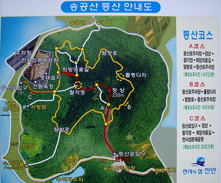*코스 A : 등산로 주차장> 정상> 팔각정> 희망의 꽃길> 송공산 분재공원> 탐방로> 등산로 주차장 (소요 시간 1시간 40분)
