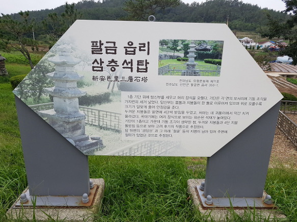 전라남도 유형문화재 제71호로 지정된 팔금삼층석탑의 조성 연대는 고려 초기로 추정된다. 1970년경 탑 부근에서 명문이 새겨진 기와편이 발견되었는데, 그곳에는 '평흥국(平興國)' 이라는 글씨가 새겨져 있었다고 한다. 떨어져 나간 부분에 '太태'자가 있었을 것으로 추정해 볼 수 있다.