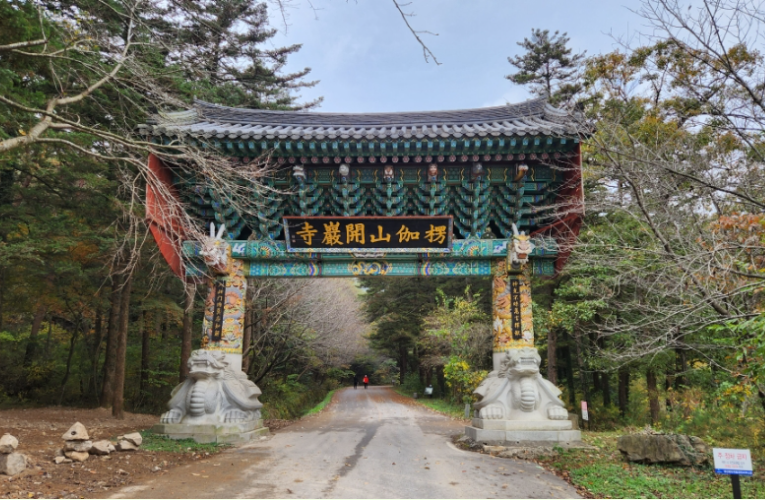 개암사는 거대한 일주문을 지나 사찰 앞마당까지 이어지는 길이 아름답다. 일주문을 지나면 큰 상록수들이 도로를 호위하듯 늘어서 있는 풍광이 멋지고, 마당으로 이어지는 소로길은 아늑한 느낌을 주는 예쁜 길이다.