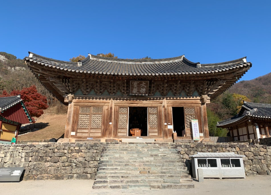 보물로 지정된 대웅전은 전면의 문짝은 꽃살 무늬를 조각한 것으로 이들은 모두 정교한 공예품들이며, 단청이 없어 더욱 자연스러운 고찰 분위기를 자아낸다. 추녀 아래 귀한 대와 내부 충량머리는 용머리를 조각하였으며, 전내 후불벽에는 백의관음보살좌상이 그려져 있는데 이는 우리나라에 남아있는 후불벽화로는 가장 큰 것이다.