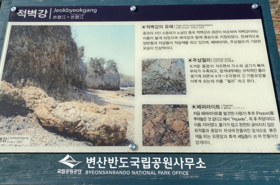 부안 격포리 후박나무 군락이 있는 연안으로부터 용두산을 돌아 절벽과 암반으로 펼쳐지는 해안선 약 2km, 291,042㎡를 적벽강이라 하는데, 대나무가 유난히 많은 죽막마을을 경계로 북쪽이 적벽강이고, 남쪽이 격포해수욕장을 포함한 채석강이다. 채석강과 함께 전북 서해안 지질공원으로 지정되어 있다.