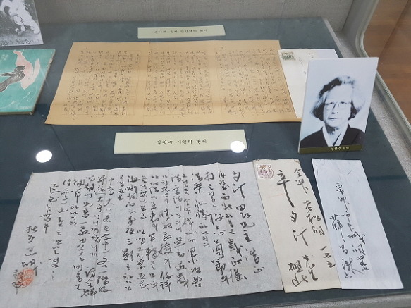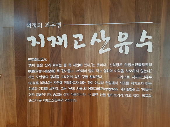 상설 전시장에서 먼저 눈에 띄는 것은 “지재고산유수(志在高山流水)”라는 현판이다. 이것은 “저 의연한 산과 유유히 흘러가는 강물의 마음을 배우자”는 시인이 좌우명을 시인의 친필로 쓴 것이다. 자연 속에서 지조의 삶을 발견한 시인의 삶이 고스란히 담겨 있는 대목이다.