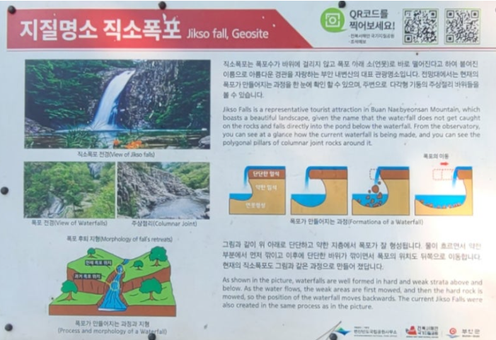 이곳에는 용이 살았다는 전설이 전해지며, 가뭄이 심할 때는 현감이 용소 앞에서 기우제를 지냈다고 한다. 직소폭포는 서해안권 국가 지질공원 명소로 지정되어 있으며, 변산응회암으로 이루어진 직소폭포와 주상절리의 형성과정을 이해할 수 있다.